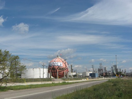 The completed project drew motorists to the freeway’s shoulder to snap pictures and stare at the baseball, creating traffic snarls on I-75. “People asked,” Lowe remembered, “if we were going to paint it like a football when baseball season was over.” For despite the game’s serenity, we remain a restless people, short on memory, and hence no match for our confidence men. Over the decades, the baseball grew two-faced. Southbound motorists saw a blown up replica of a baseball, pure and simple. Northbound motorists saw the same ball smeared with advertisements for television and radio stations. In 2005, following the Detroit Pistons’ 2004 NBA championship and “five game sweep,” the baseball was repainted as a basketball with “Pistons 2004 NBA Champs” emblazoned beneath the Marathon emblem.