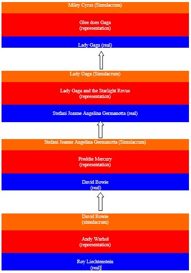 This process has increased in speed in the last fifteen years since Savage’s commentary. What needs to be tracked with some care is the momentum at which any era of new pop becomes old pop – partly because pop history embraces a version of Pop Art, a notion that Lady Gaga has (ad)dressed each day of her career. Writer Simon Reynolds, in his book Retromania: Pop Culture’s Addiction to Its Own Past, has turned his pop history expertise to some of these questions. He details the process of rewinding and rewriting in the pop era. He explores the crucial question of “the simultaneity of pop time” (x), and in doing so Reynolds lays out what happened when we ran out of past in the early years of the millennium. He claims that "instead of being the threshold to the future, the first ten years of the twenty-first century turned out to be the “Re” Decade…if only it was just the old music and old musicians coming back, in archived form or as reanimated performers. But the 2000s was also the decade of rampant recycling: bygone genres revived and renovated, vintage sonic material reprocessed and recombined" (xi). Encouragingly, Reynolds is still a progressive: he believes that originality is possible and states, “I still believe the future is out there” (428). Yet one strand of this future is originality through the speed of change rather than new content. Pop content is degrading, through cascading cycles and loops. To reveal the mechanism for this recycling, we must step into Jean Baudrillard’s simulacrum. Baudrillard’s important over-cited but under-read Simulacra and Simulation, published in 1981, is often cited as one of the key books in theorizing postmodernity. Whatever the outcome of the myriad debates about Baudrillard’s relation to postmodernity, most importantly, this book analyzes contemporary notions of knowledge, truth and falsehood. It opens with a quote from Ecclesiastes that is a fake, which generations of naïve scholars have restated as a truth. The quote from Ecclesiastes/Baudrillard provides the basis of this new model for pop: "The simulacrum is never what hides the truth – it is truth that hides the fact that there is none. The simulacrum is true" (Baudrillard 1). He confirmed that "something has disappeared" (2), and "the era of simulation is inaugurated by a liquidation of all referentials" (2). He located a system of signs composed of "a material more malleable than meaning, in that it lends itself to all systems of equivalences" (2). Therefore, the simulacrum is not an illusion, mask or disguise; instead, it is the loss of the real. The task emerging from Jean Baudrillard’s hypotheses and arguments is to conceptualize the abstraction, which seems an appropriate use of Ecclesiastes/Baudrillard. For Baudrillard, there is a three-layered way to think about life: the real, the representation, and the simulacra. Baudrillard's theory means that an action, event or text is not only immediately represented through media but also is inevitably and rapidly re-represented. It circulates as a dis-anchored signifier (form), which means that information – content – is disconnected from context and temporarily hooks into ephemeral media, only to unhook and continue moving. The consequences of such decontexualization are that celebrities, magazines, and consumerism become a proxy for the real (see Inglis; Turner). The news is not real. It is a representation of the real. Yet most of us are spending more and more time in the simulacrum, the representation of the representation. Life is real. But tabloidized media means that most of us, most of the time are living through and with other people’s representations. These signifiers, without anchorage to a context, circulate through the simulacrum and bounce around the digitized, convergent, Web 2.0 environment. Baudrillard's model does not stop at this point. On the first page of Simulation, he argued that the simulacrum creates and implements its own referential system: the hyperreal (1), which is constituted within the simulacra and does not require anything external or contextual to provide meaning and authenticity (Genosko 41). In other words, the re-representations appeal to other re-representations for credibility and verification. If it is on Twitter, then it must be true. What the hyperreal configures is a system whereby representations talk amongst themselves (Baudrillard, Fatal Strategies 9-10), disconnecting further from any notion of the real. The simulacrum becomes the real for the next cycle of significations. It is a cascading model. The simulacrum in one era becomes the real in the next, which means that transitory and ephemeral celebrity culture becomes the anchor – the real – for the next representation and simulacrum. Twitter is the great example of the simulacrum. An event happens. It is reported online. It is then commented on via twitter and blogs, without anchoring to earlier knowledge, references or history. Instead, the mashup uses other re-representations as textual fodder to create something new. This vertical tumbling of real, representation, and simulacrum is accomplished at great speed. This movement and change was described by Baudrillard as "replacing." He asked, "Nazism, the concentration camps or…did all those things really exist? The question is perhaps an intolerable one, but the interesting thing here is what makes it logically possible. And in fact what makes it possible is the media’s way of replacing any event, any idea, any history with any other" (The Transparency of Evil 91). This passage remains a controversial and disturbing one from Baudrillard. In the wrong hands, he could appear a holocaust denier, but his argument is much more complex. He explains how and why holocaust deniers are possible or indeed Charles Darwin deniers or the flat earth movement. Baudrillard describes this process as being based on the media "replacing" – or as we would prefer to r