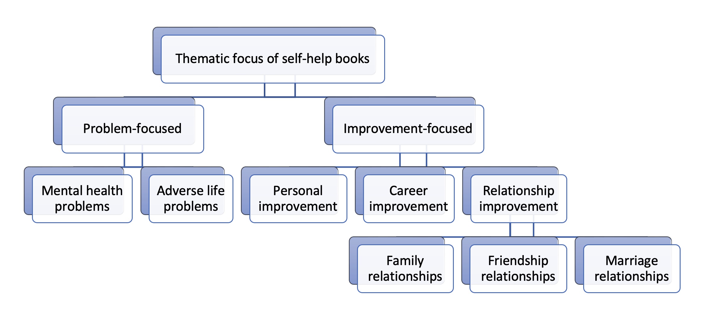 The first class is termed Problem-focused and consists of self-help books that are concerned with addressing specific problems that their readers are experiencing, followed by possibilities for their resolutions. This class of self-help books can be further divided into two categories. The first category focuses on offering prescriptive advice and measures for their readers to help them overcome mental health-related issues such as stress, depression, or anxiety. Some of the more well-known examples of these books are Don't Panic, The Stress Solution, and Feeling Great. The focus of the second category is oriented towards offering counsel and guidance to help their readers adapt to and cope with major life events and transitions including death of a loved one, separation, job loss, and retirement. Examples of books that fall within this category are Recovering from the Losses of Life, Transitions: Making Sense of Life's Changes, and You Can Heal Your Heart. The first sub-category encompasses self-help books that deal specifically with family relationships and parenting issues. Such books are intended for those with an interest to learn how to improve and reform relationships and interactions within the familial context. The following are some examples of these books: The 7 Habits of Highly Effective Families: Building a Beautiful Family Culture in a Turbulent World; The World's Easiest Guide to Family Relationships; and The Blessing: Giving the Gift of Unconditional Love and Acceptance. The second sub-category consists of self-help books that are aimed at the development and improvement of friendship relationships. They offer practical instructions to help their readers enhance their socialization skills, make and maintain real friendships, or even increase their popularity. Some examples of these books are as follows: Friendshifts: The Power of Friendship and How It Shapes Our Lives; Stop Being Lonely: Three Simple Steps to Developing Close Friendships and Deep Relationships; and Frientimacy: How to Deepen Friendships for Lifelong Health and Happiness. The final sub-category comprises self-help books that are designed to provide married couples with knowledge, skills, and tools that they can employ to strengthen their marital relationships and improve the way they relate to each other. Here are some examples of such books: Don't Sweat the Small Stuff in Love; Relationship Rescue: A Seven-Step Strategy for Reconnecting with Your Partner; and Chicken Soup for the Woman's Soul.